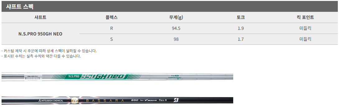 그라파이트 샤프트는 미쯔비시 케미컬의 OEM 생산품 바사라 B50 For V300IX입니다. 아직 홈페이지에 자세한 스펙은 나와있지 않으며, 이전 세대의 스펙과 유사할 것으로 예상됩니다. 참고로 8세대 그라파이트 샤프트의 스펙은 무게 55g 토크 3.8 미들킥이었습니다.