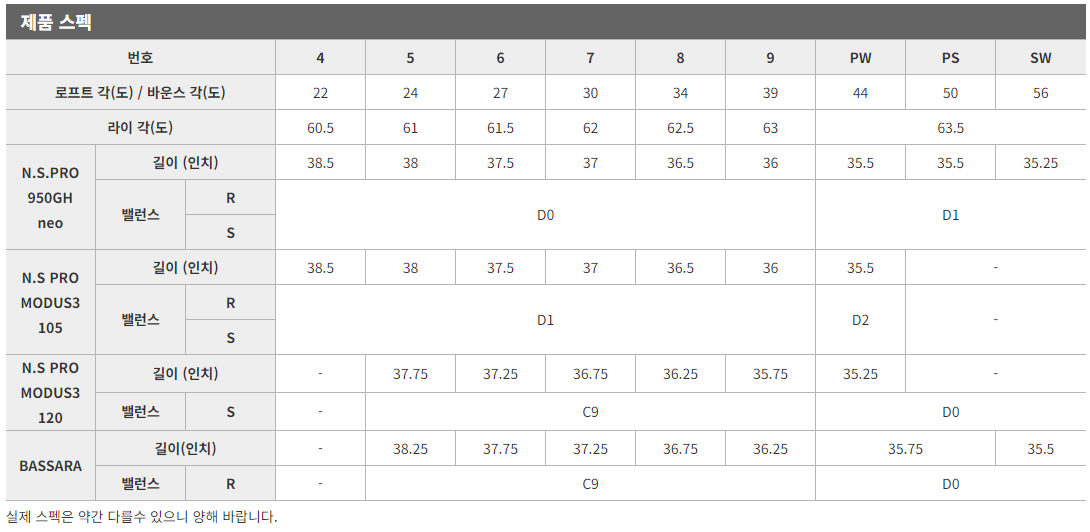 V300 아이언의 스펙을 살펴보겠습니다. 4번은 로프트 22도로 되어있으며 기준이 되는 7번 아이언은 30도의 로프트각을 가지고 있습니다. 일반 선수들이 사용하는 7번은 34도에서 36도 정도로 되어 있는데요. 선수가 사용하는 아이언보다 다소 로프트각을 낮추어 같은 번호의 클럽으로 더 먼 비거리를 내보낼 수 있는 이점이 있습니다.