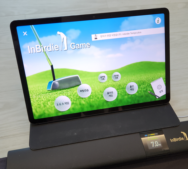 인버디의 가장 핵심 기능인 인버디 게임 어플을 실행해 보았습니다. 휴대폰으로 연결하여 실행할 수도 있는데, 아무래도 스마트폰은 화면이 작기 때문에 퍼팅 거리나 각도 등 숫자가 잘 보이지 않습니다. 그래서 저는 태블릿을 이용하여 인버디를 사용합니다.