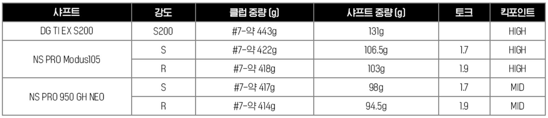 샤프트의 무게를 선택하는 기준은 여러 가지가 있으며, 드라이버 비거리로 샤프트를 선택할 수 있도록 가이드라인을 제시해 드리겠습니다. 먼저 드라이버의 비거리(캐리+런)가 240m 이상이라면 DG TI EX S200을 선택하는 것을 추천하며, 비거리가 200m 정도라면 NS PRO 950GH NEO R을 추천합니다.