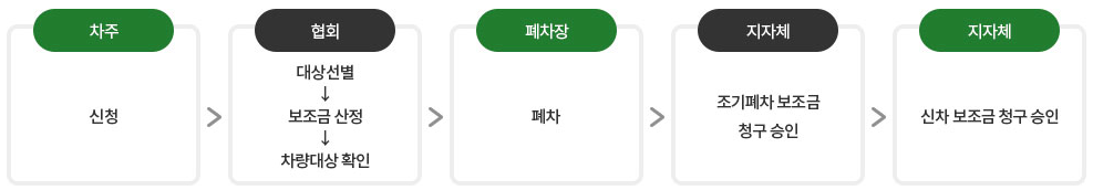 진행 단계의 핵심은 폐차 지원금 대상 차량 확인 > 폐차 > 지원금 지급으로 단계에 맞추어 폐차 절차를 진행하셔야 합니다.